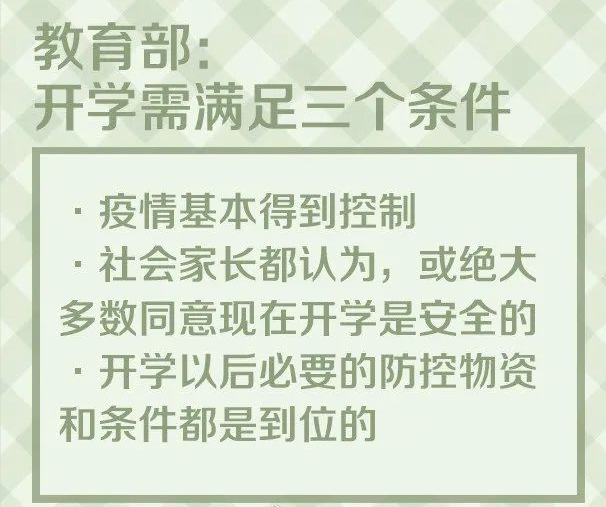 3月13日,教育部应对疫情工作领导小组王登峰在接受采访时说,开学必须满足三个条件:一是疫情基本得到控制;二是大多数家长同意说现在开学是安全的;三是开学后防控物资和条件到位。虽然只有三句话,但是条件极为严格。第一个条件是国家说了算,相关部门领导经过科学研判后认为可以开学才开学;第二个条件是人民说了算,要大部分家长觉得安全才可以开学。第三个是条件实力说了算,开学后需要的物资必须到位才行。